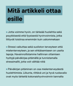 Tutkimukset ovat osoittaneet, että tunteiden ja ajatusten muistiin kirjoittaminen voi parantaa psyykkistä hyvinvointiamme. Se auttaa sinua hallitsemaan tunteitasi tunnistamalla huolta aiheuttavat ajatukset. Se auttaa myös tunnistamaan, mikä laukaisee stressin. Kun näet ajatuksesi ja käyttäytymisesi kirjoitettuna, voi myös olla helpompi suhtautua positiivisesti itseensä ja se voi auttaa sinua selviytymään stressaavista tilanteista tulevaisuudessa.